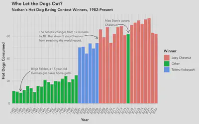 Image Credit:MichaelIn the wake of yet another history-making performance by Joey Chestnut in the annual Independence Day Nathan’s Famous Hot Dog Eating Contest, I decided to take a visual dive into the history of the contest’s winners.